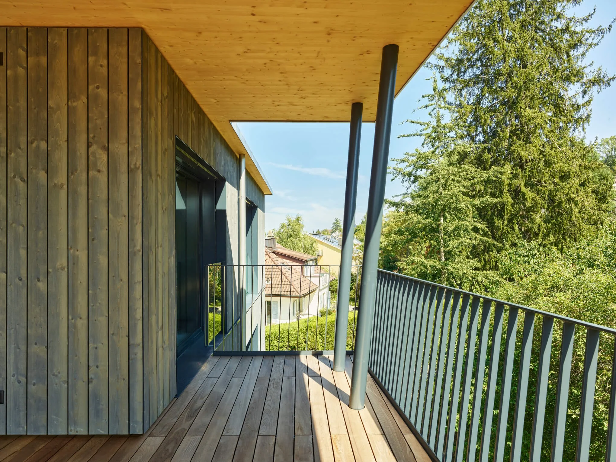Balkon mit Holzfußboden, Holzverkleidung an der Wand, und modernem Geländer, umgeben von grünen Bäumen, bei sonnigem Wetter.