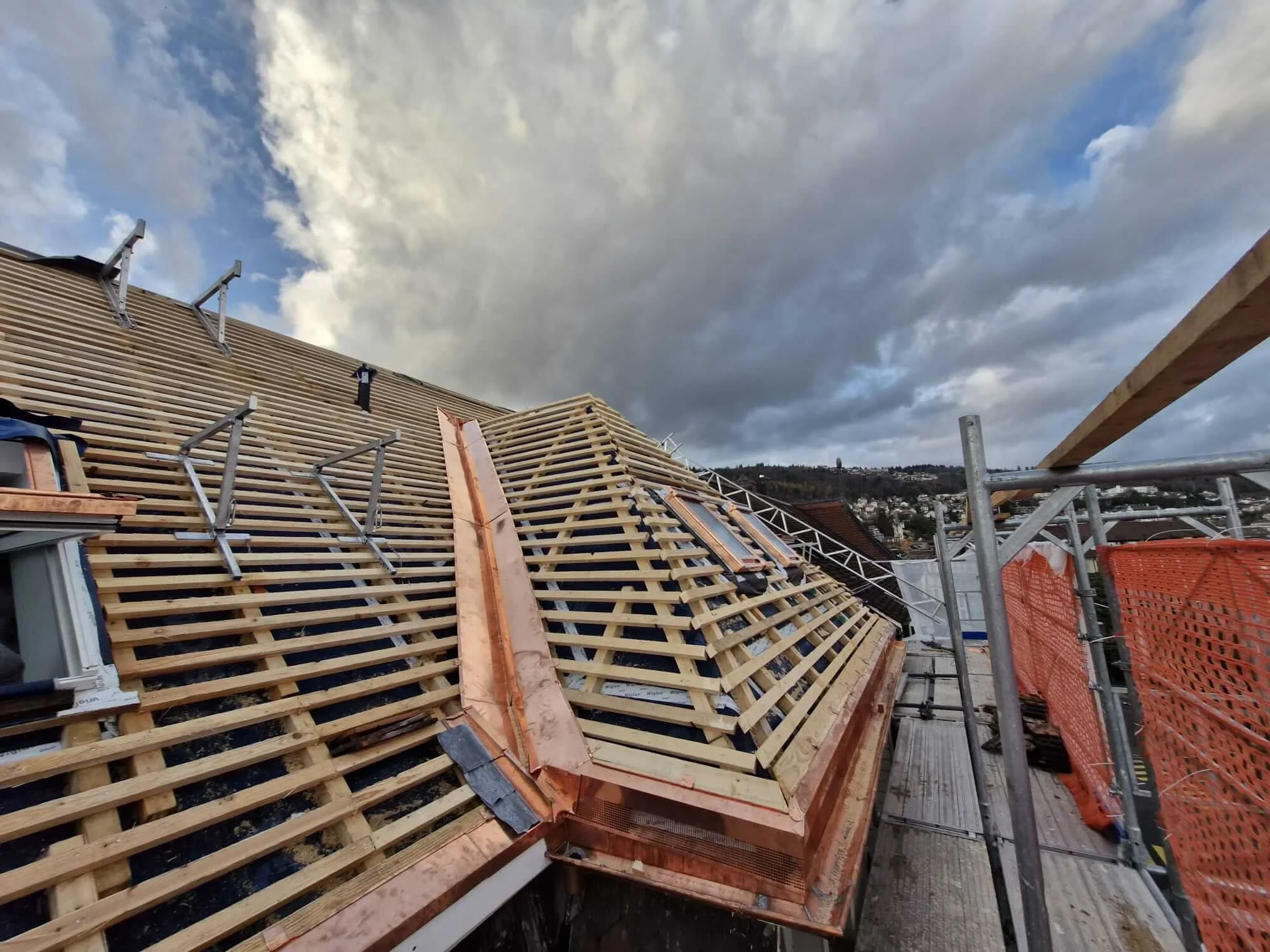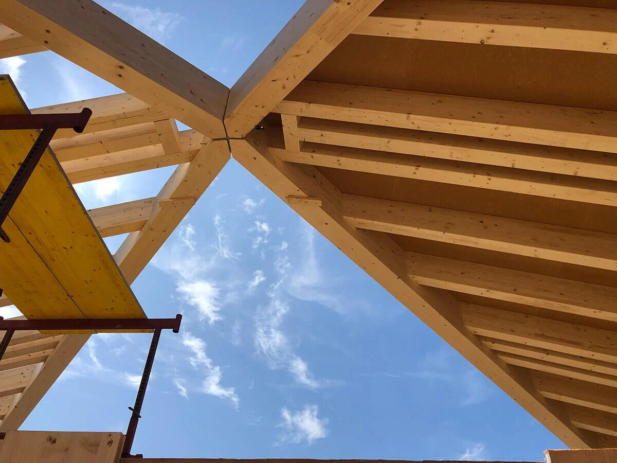 Gebäude mit eingerüsteter Dächerkonstruktion aus Holz und Metall, auf einer Baustelle mit Blick auf den Himmel und umliegende Stadt im Hintergrund.