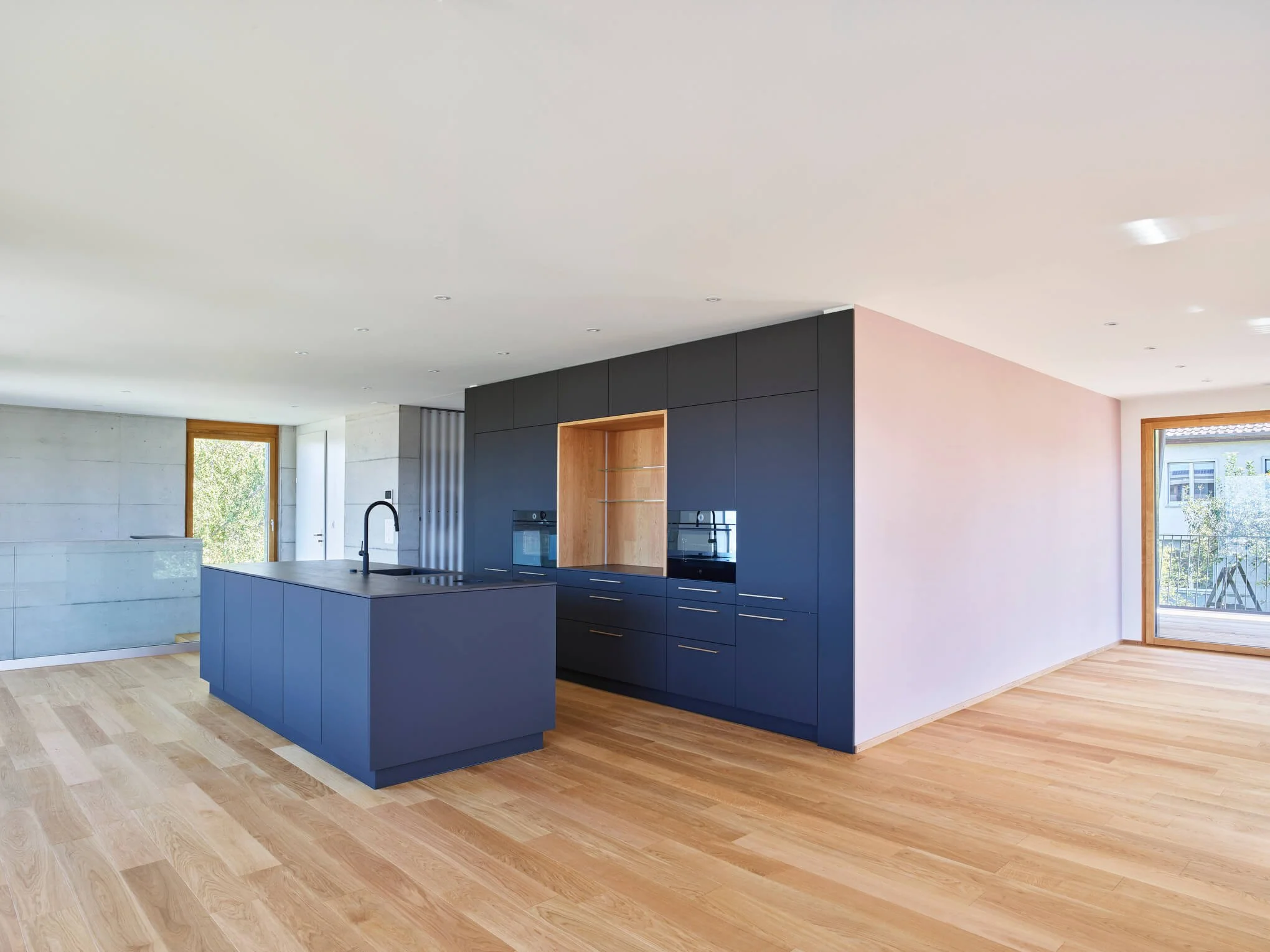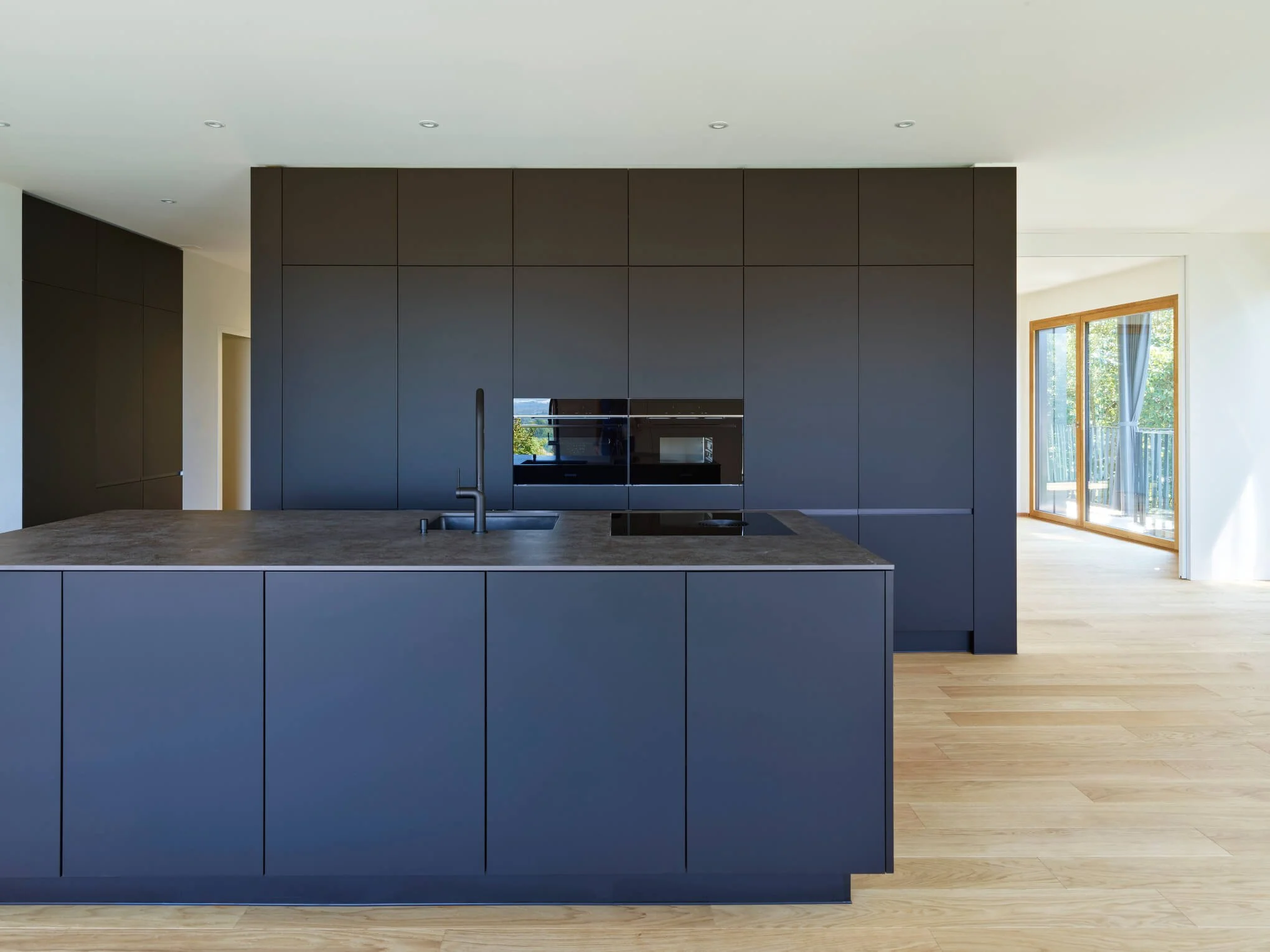 Moderne Kücheneinrichtung mit schwarzen Schränken, Holzfußboden und einem Balkon mit Glasfenstern im Hintergrund.