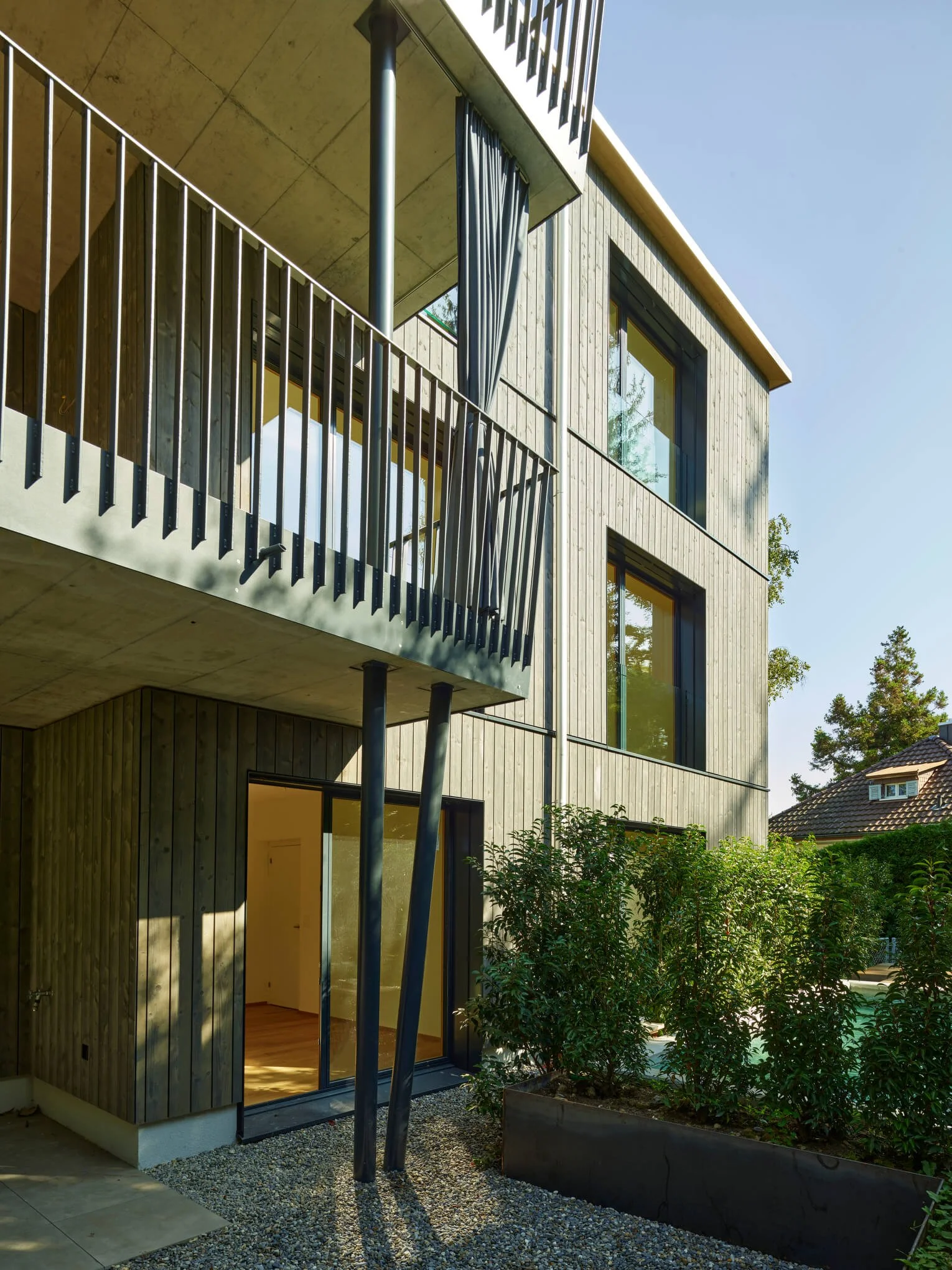 Modernes mehrstöckiges Wohnhaus mit Holzfassade, große Fenster, Balkon mit Metallgeländer, Garten mit Bäumen und Steinen auf dem Boden, blauer Himmel.