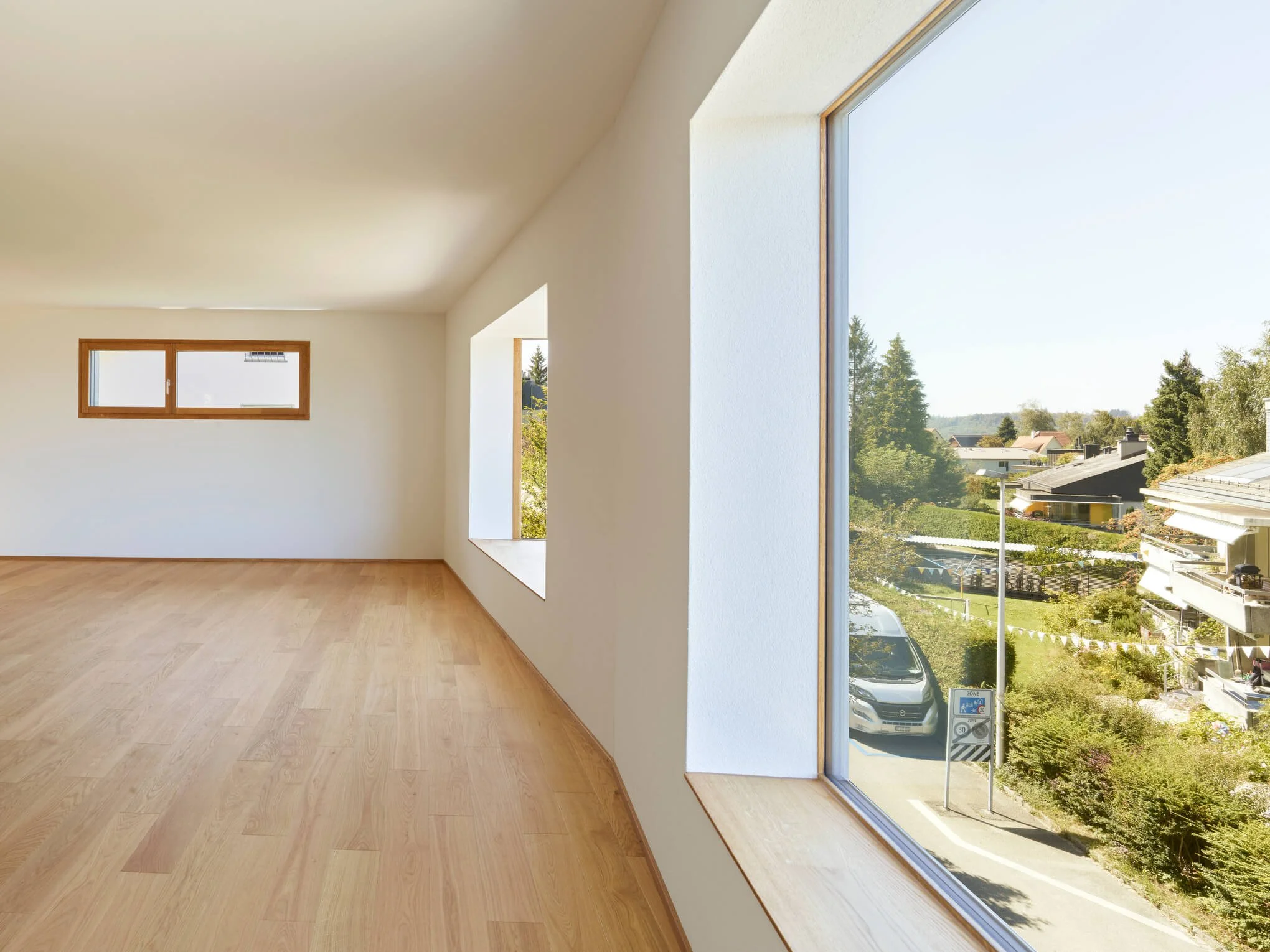 Ein leeres, sonniges Zimmer mit großen Fenstern und Holzboden, Blick ins Freie mit abgestellten Autos und Häusern in einer ruhigen Nachbarschaft.