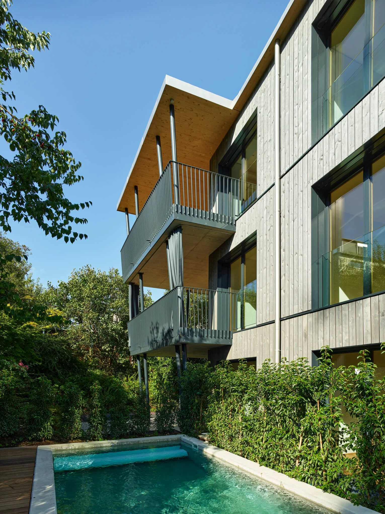 Modernes Mehrfamilienhaus mit Holzverkleidung und Balkonen, umgeben von Bäumen und einem kleinen Pool.