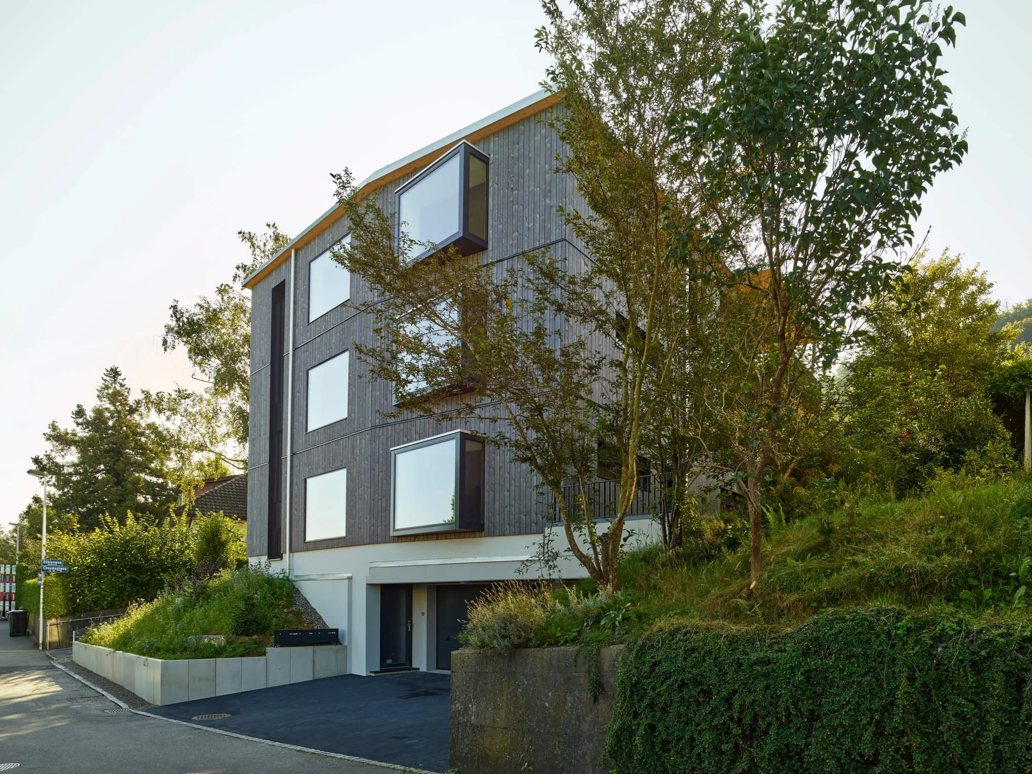Modernes vierstöckiges Haus mit dunklem Holzfassade und großen Fenstern, umliegendes grünes Gelände, auf einem Hang gebaut, mit Straßen im Vordergrund.