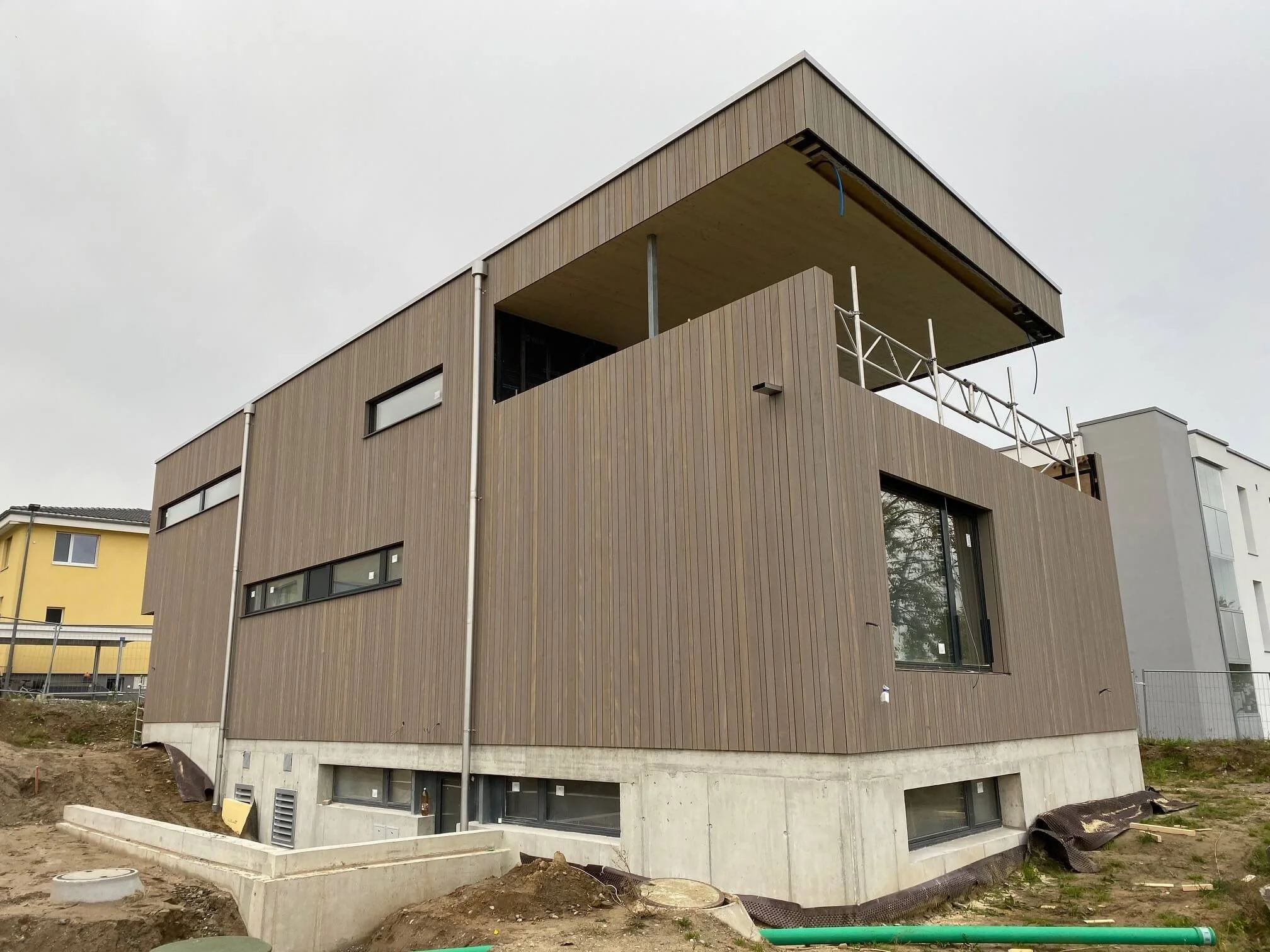 Modernes mehrstöckiges Haus unter Bau, mit Holzverkleidung und Betonsockel, auf unbefestigtem Gelände.