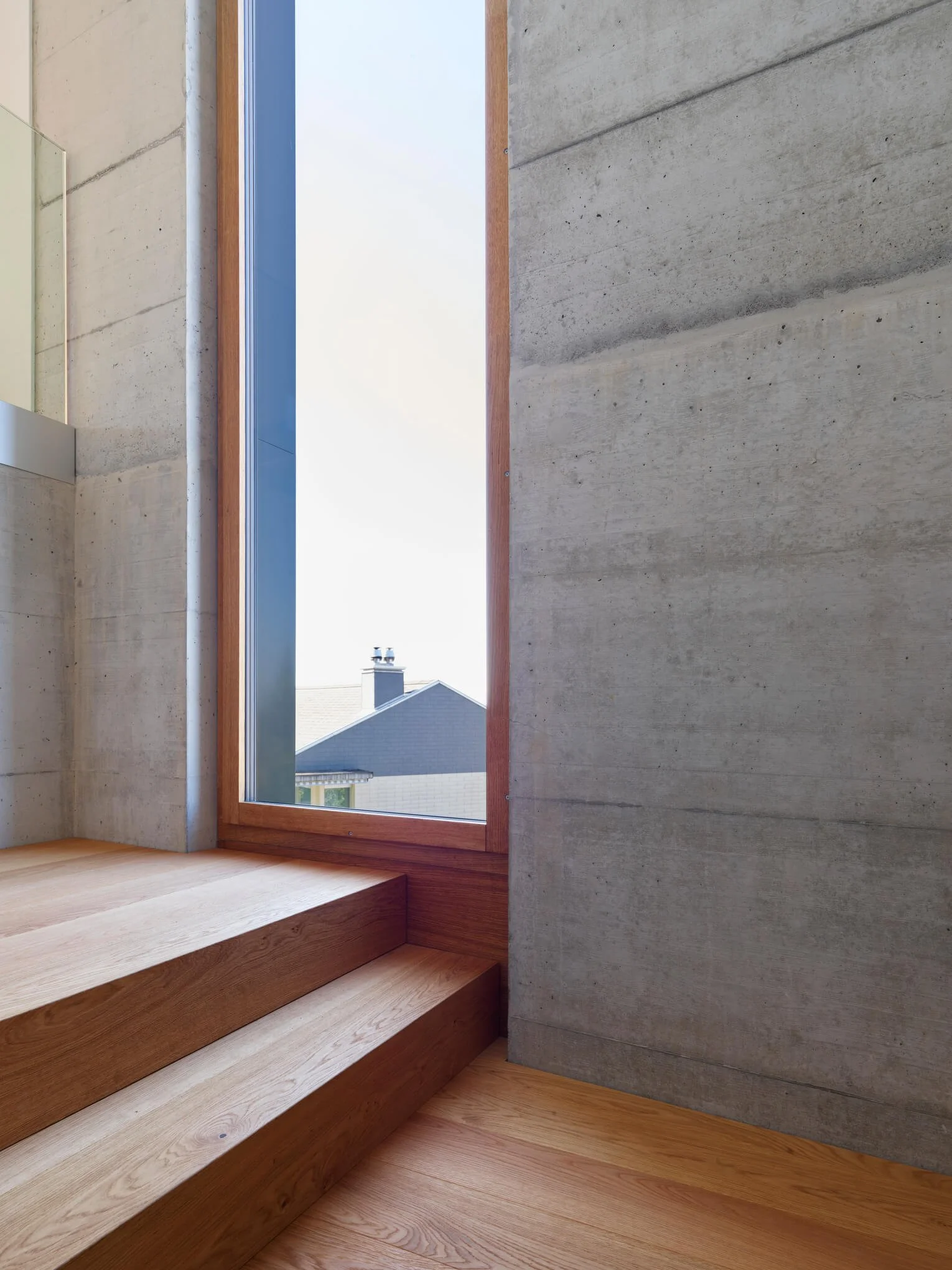 Innenaufnahme eines Zimmers mit Holztreppen, großen Fenster und Sicht auf ein Dach mit Schornsteinen.