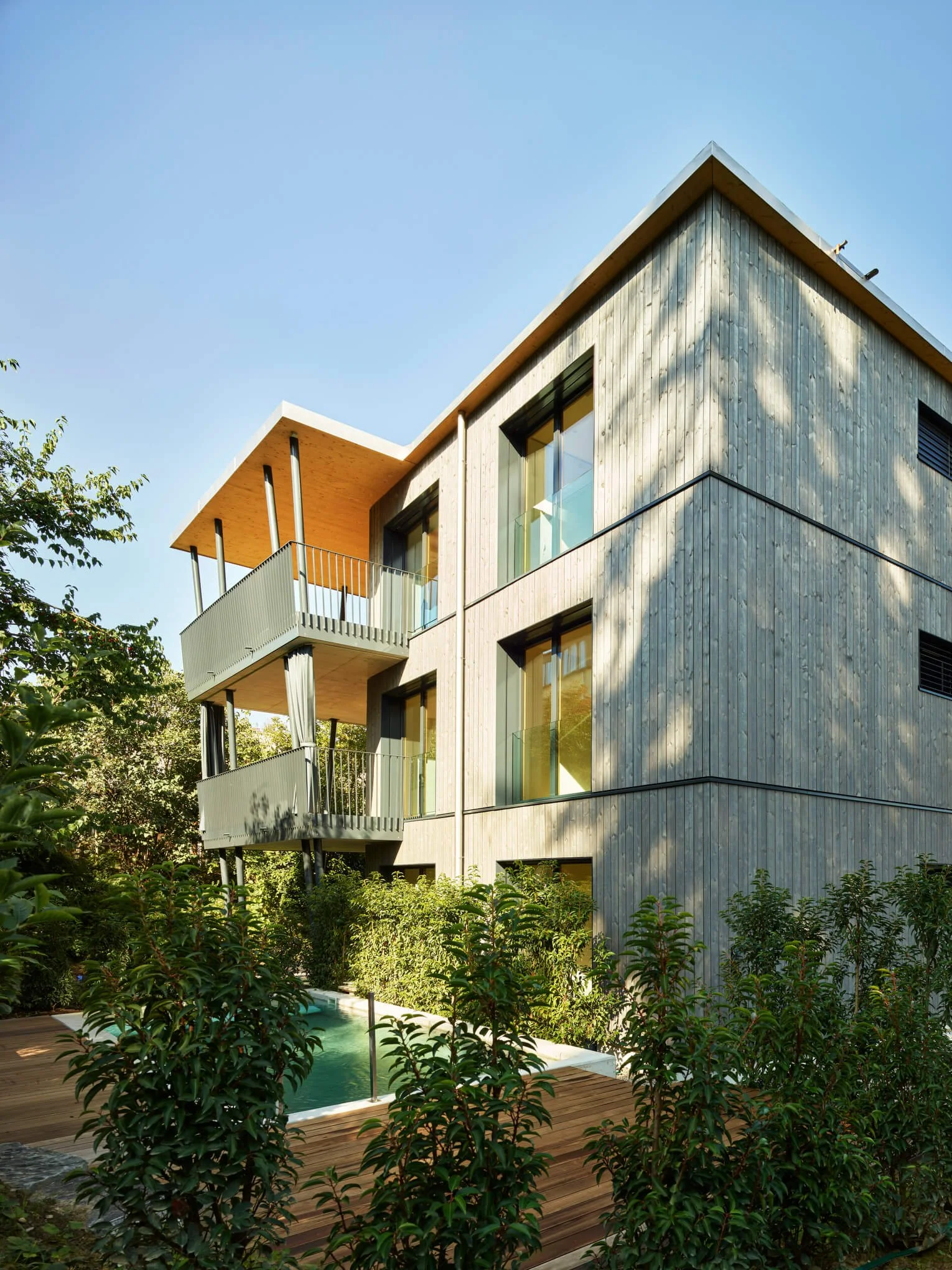 Moderner Mehrfamilienhaus mit zwei Balkonen, Holzfassade, umgeben von Büschen und Bäumen, mit einem kleinen Pool im Vordergrund.